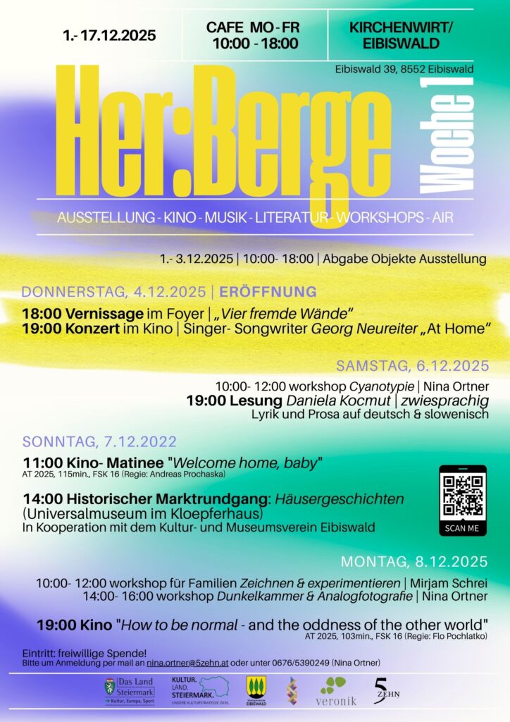 Auch am Feiertag, Montag, 8. Dezember, öffnet Her:Berge seine Türen. Von 10:00 bis 12:00 Uhr leitet Mirjam Schrei einen Familienworkshop zum gemeinsamen Zeichnen und Experimentieren. Zwischen 14:00 und 16:00 Uhr führt Nina Ortner in die Welt der Dunkelkammer und der analogen Fotografie ein. Den Tagesabschluss bildet um 19:00 Uhr der Kinofilm „How to be normal – and the Oddness of the Other World“ (AT 2025) von Flo Pochlatko, ein vielschichtiger Blick auf gesellschaftliche Normen und das Ringen um Zugehörigkeit.